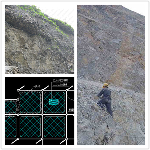 一、主动防护网安装流程将锚杆以4.5米的间距,从上而下,排列成矩形,用空压机控制风钻打孔,打孔的深度根据岩石的风化、硬度而定,一般会安装客户图纸的要求,常见的锚杆长度为2米,将锚杆插进洞里,用水泥灌浆固定。2..锚杆固定好之后,将钢丝绳网从上而下一卷一卷的铺展开,用铁丝固定。3.将纵横支撑绳从锚杆的鸡心环传入,开端用卡...